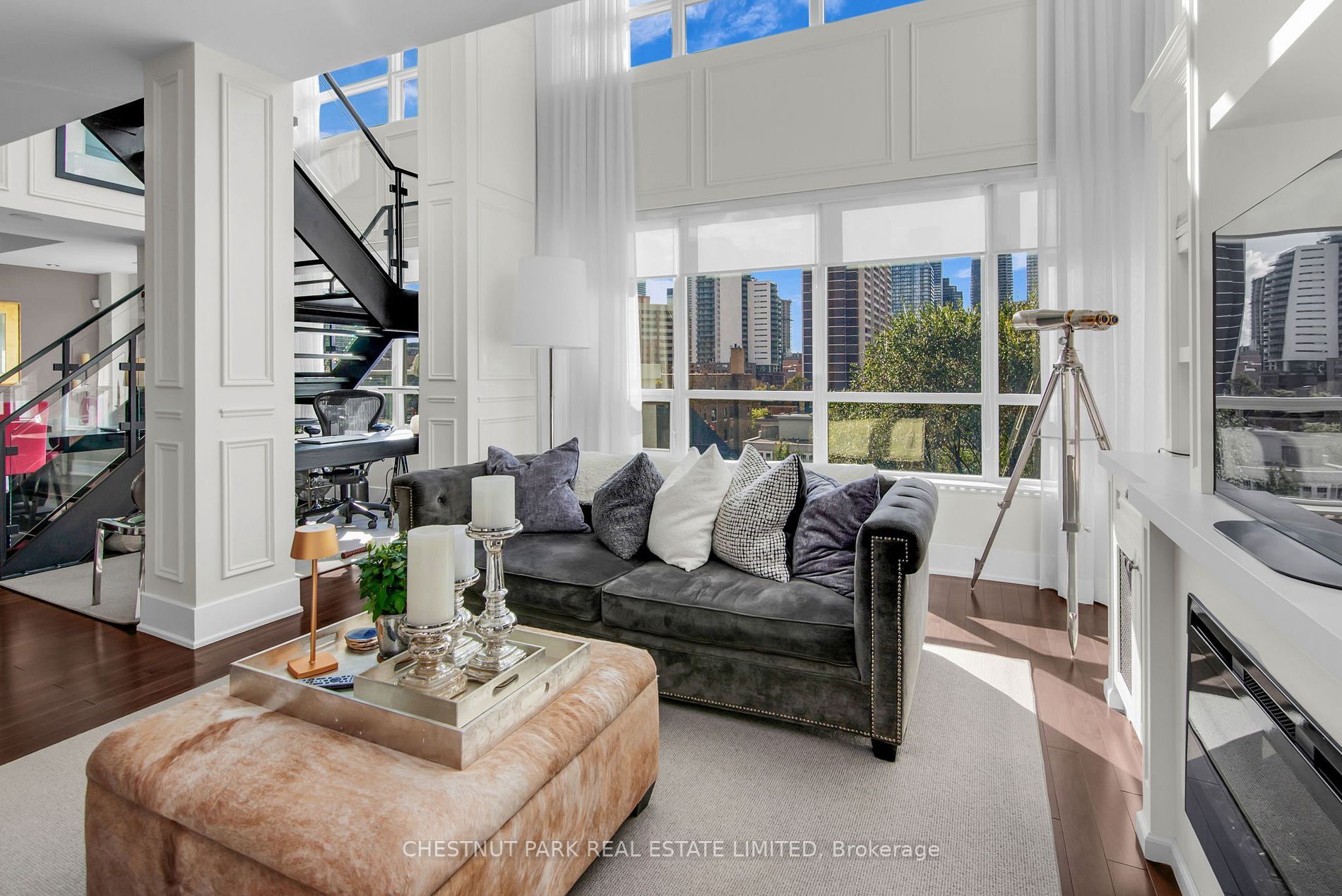 The Verve by Tridel is an award-winning LEED-certified residence that redefines sophisticated urban living in downtown Toronto. This rare two-storey, 2 bedroom loft spans 1,541 sq. ft. of meticulously designed space, complemented by a 75 sq. ft. west-facing terrace where you can enjoy radiant sunsets & effortless outdoor entertaining with a built-in gas connection. Upon entry, the double-height ceilings & striking wall of floor-to-ceiling windows immediately set the tone for a home defined by light, volume, & modern elegance. The open-concept layout seamlessly connects living, dining, & kitchen spaces, creating an inviting atmosphere ideal for both refined entertaining & everyday comfort. The chef-inspired kitchen features quartz countertops, premium stainless steel appliances, a breakfast bar, + a built-in Miele coffee machine designed to elevate each morning ritual. Rich hardwood flooring extends throughout, enhancing the sense of warmth & sophistication. The floating industrial-style staircase ascends to the private upper level, where 2 generously proportioned bedrooms each offer a tranquil retreat. The primary suite impresses with dual walk-in closets + a serene, spa-inspired five-piece ensuite designed for relaxation & restoration. The second bedroom, complete with its own three-piece ensuite, provides the perfect balance of comfort & privacy.