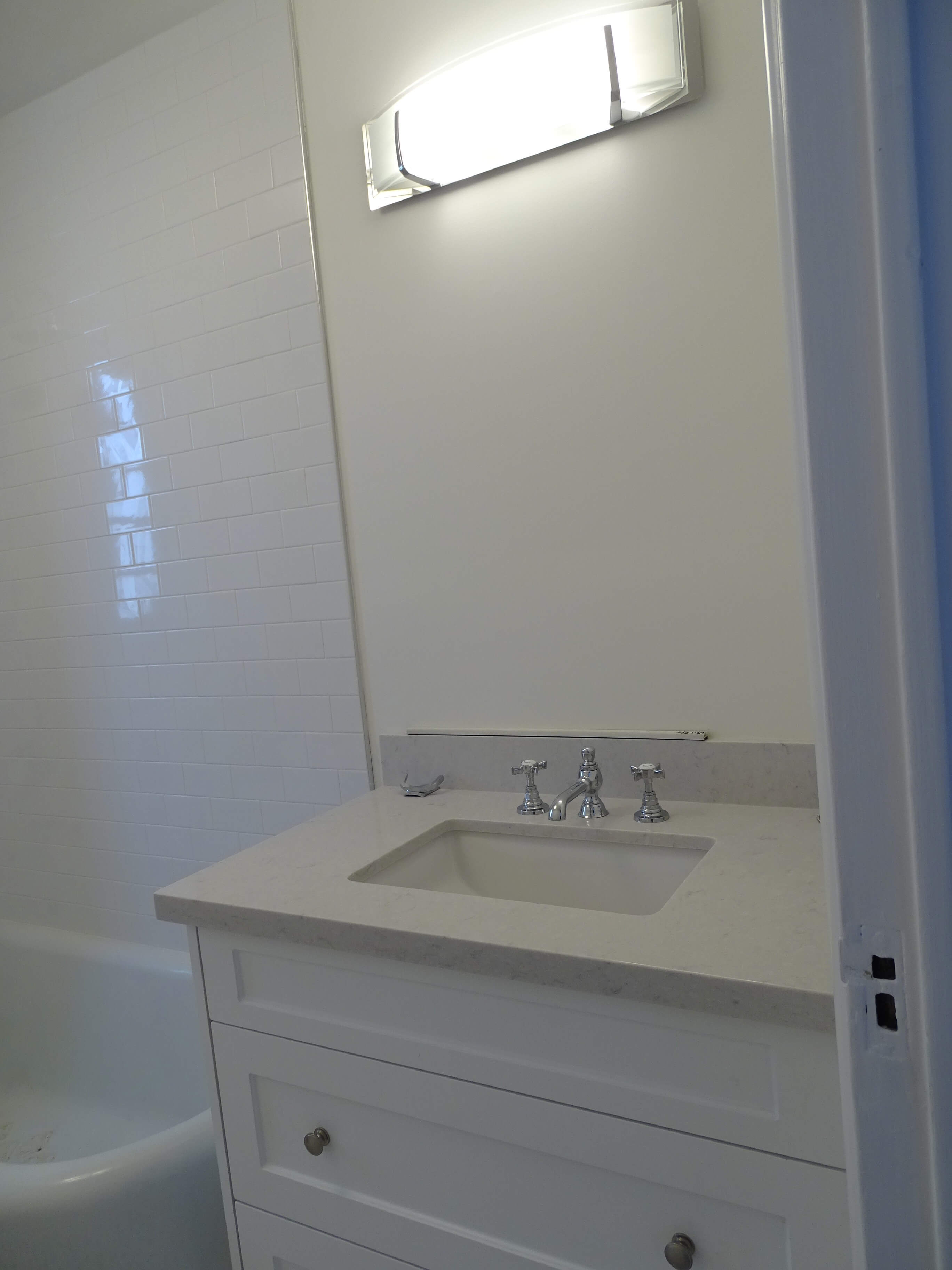 Kitchen: Bright white galley kitchen, with stainless steel appliances